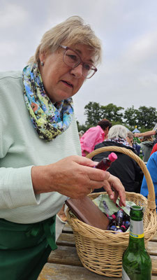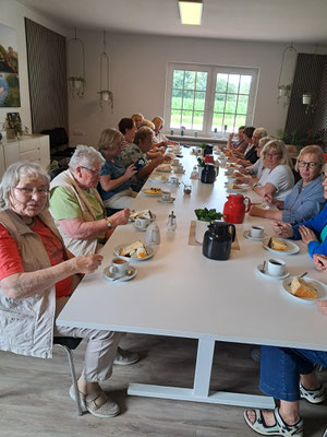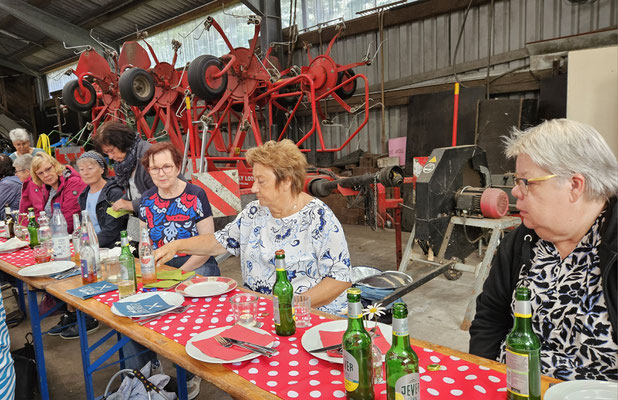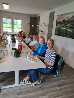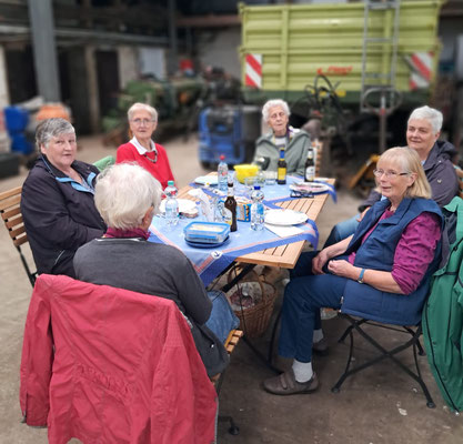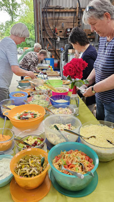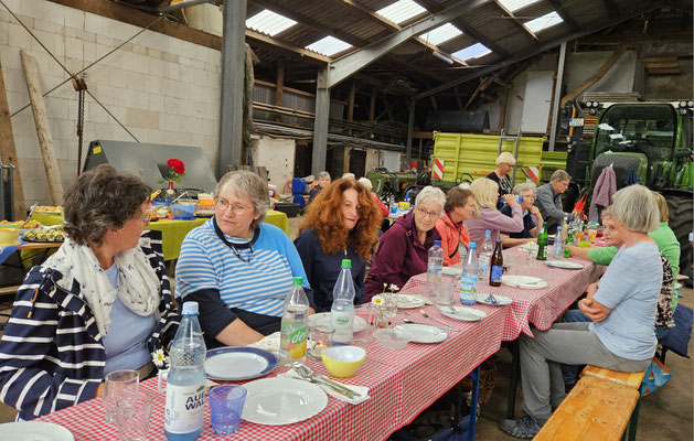 Nach der Führung ging es in die Scheune zum Buffet. Alle Landfrauen hatten eine "Kleinigkeit" für das Buffet mitgebracht, so dass es ein riesiges Angebot an leckeren Sachen zu Essen gab. Außerdem gab es dazu noch Grillwürstchen und eine große Auswahl an Desserts. Die Stimmung war entsprechend gut, gut gesättigt und bei bester Laune traten die Landfrauen dann den Heimweg an. Auch wenn die Sonne sich nicht gerne zeigen wollte, war es wieder einmal ein sehr schönes Sommerfest.